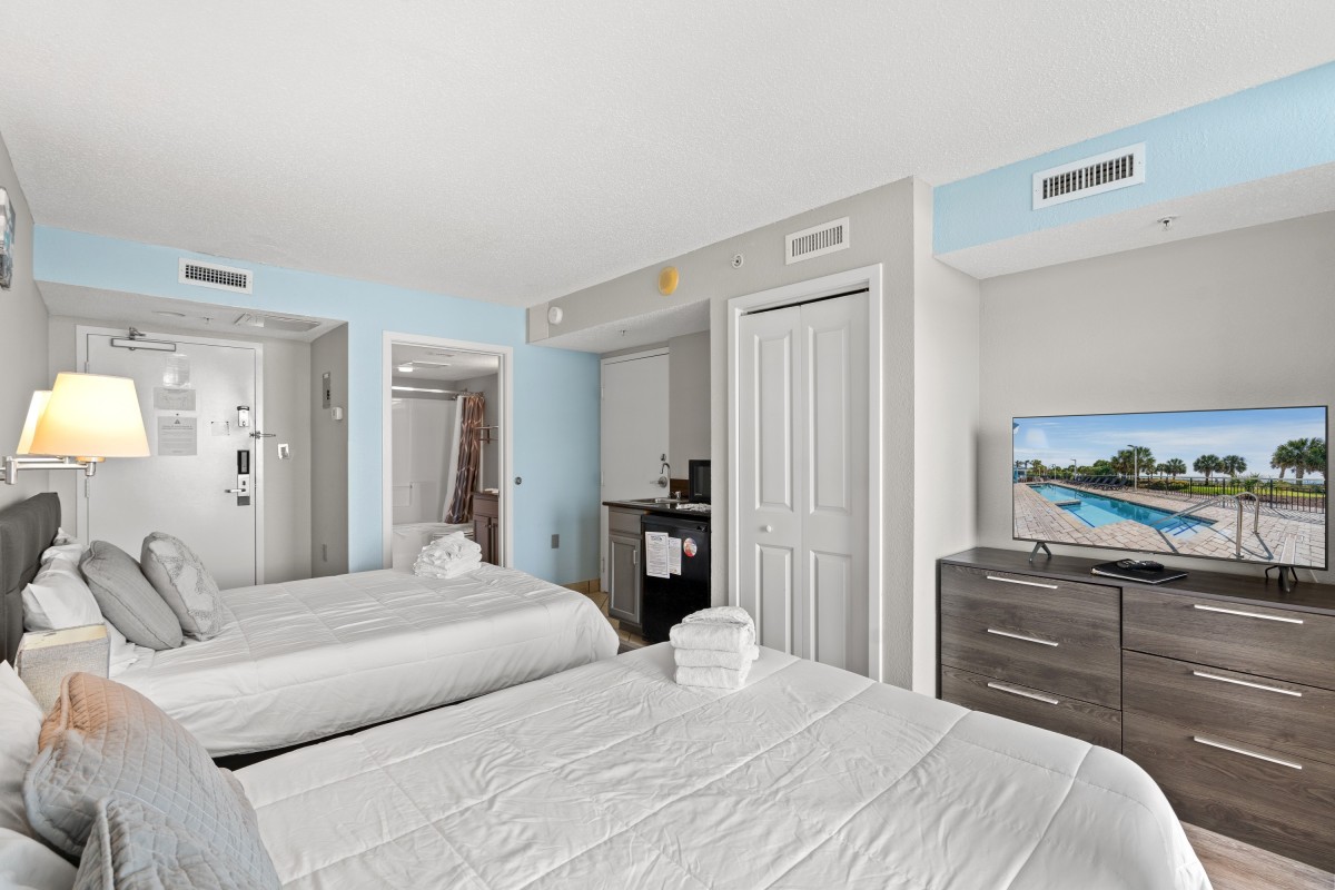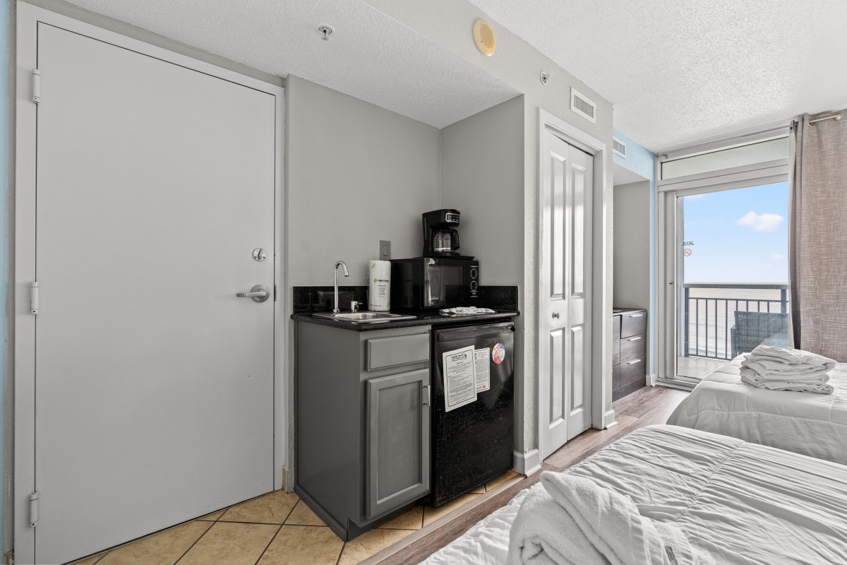 Bay View Resort 604B is the perfect beach vacation rental for small families or couples. One of the best features is the furnished oceanfront balcony. This spot is ideal for watching an East Coast sunrise or sunset. An efficiency kitchen has a small refrigerator, microwave, and coffee maker. The room is brightened by sunshine streaming in through the floor-to-ceiling sliding glass door leading to the balcony. You will love having complimentary WIFI for entertainment and central heating and air conditioning to keep you cool. Bay View Resort has everything you need for a worry-free vacation!