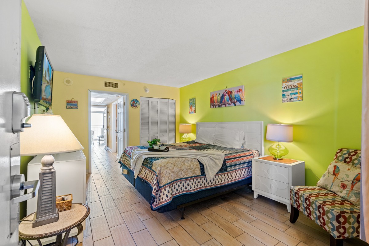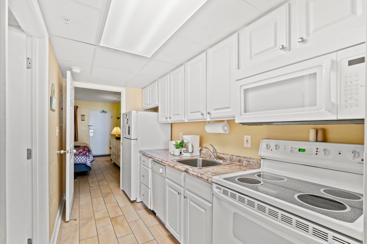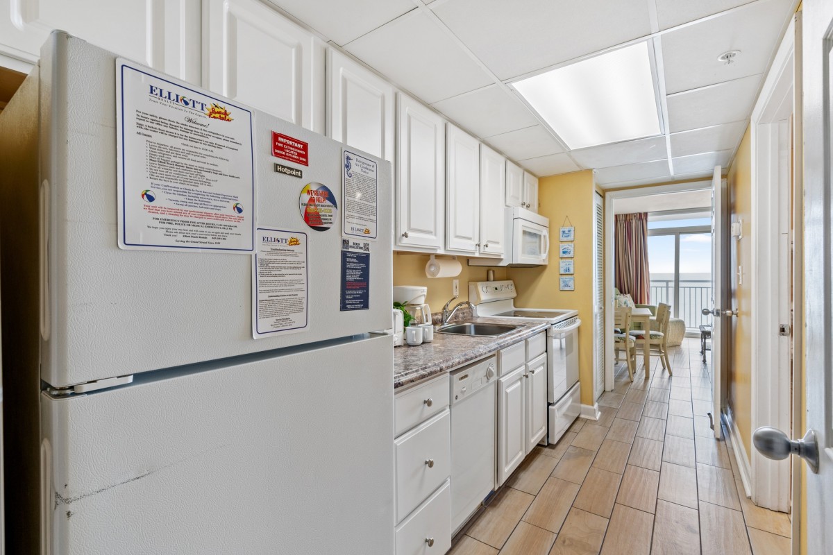 Spend time alone or with a loved one on the private balcony. This balcony has an astounding view from the 17th floor that is hard to beat. Two chairs and a table means there is room for you to bring your morning coffee or afternoon cocktail outside, and you will have a private, front-row seat to all the Atlantic Ocean has to offer. You will still have an amazing view indoors, from the comfy living room couch to the kitchen. You can easily prepare meals of all sizes in the fully equipped kitchen. Use the dishwasher for easy cleanup. Other amenities include two flatscreen TVs and central heating and air. The entire condo is bright with a tropical décor.