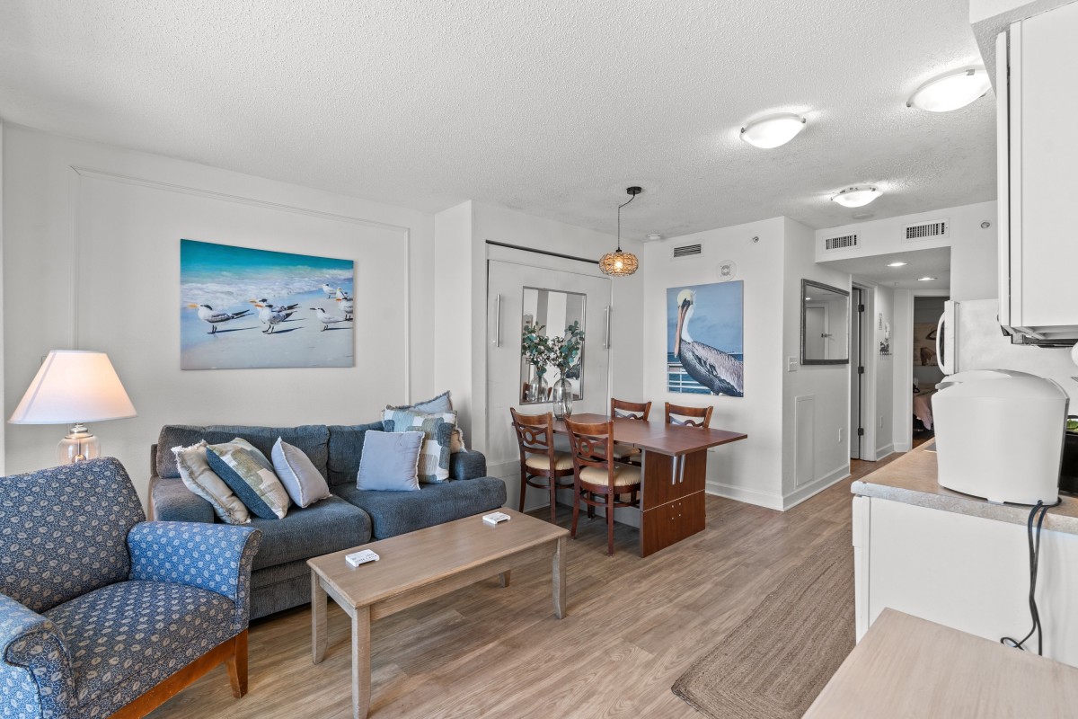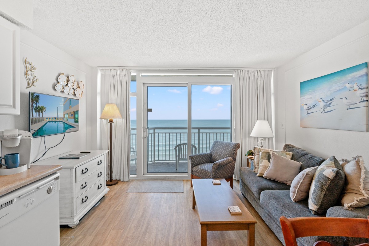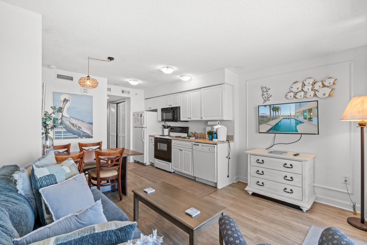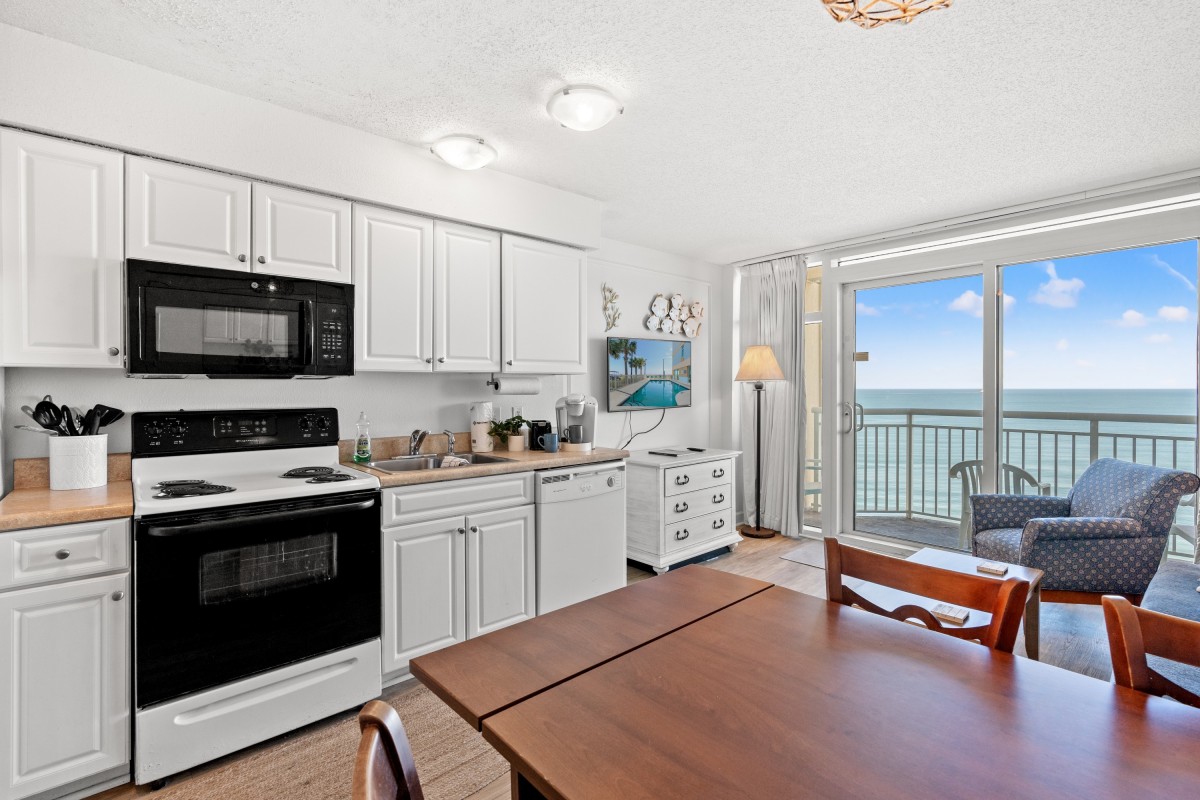The private furnished balcony is one of the best features. You can sit in this secluded spot for hours while listening to the waves crashing upon the shore, seagulls flying by, and children playing in the sand. You will still have a fantastic view indoors through the sliding glass door. The living room area includes a dining table and is right next to the kitchen. Easily prepare your favorite meals and snacks in the galley-style kitchen with full-sized appliances. There is even a dishwasher! Other amenities include two flatscreen TVs, complimentary WIFI, a washer and dryer, and central heating and air.
