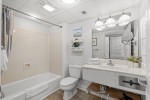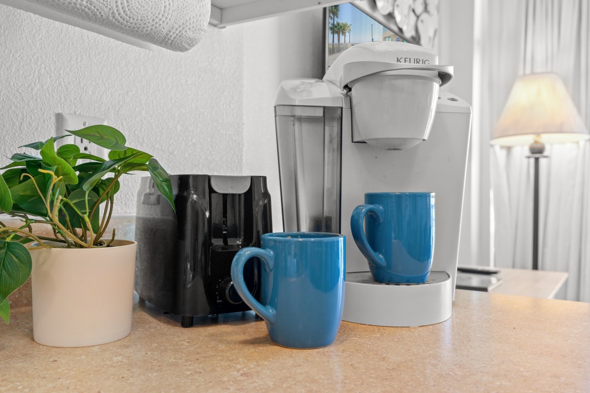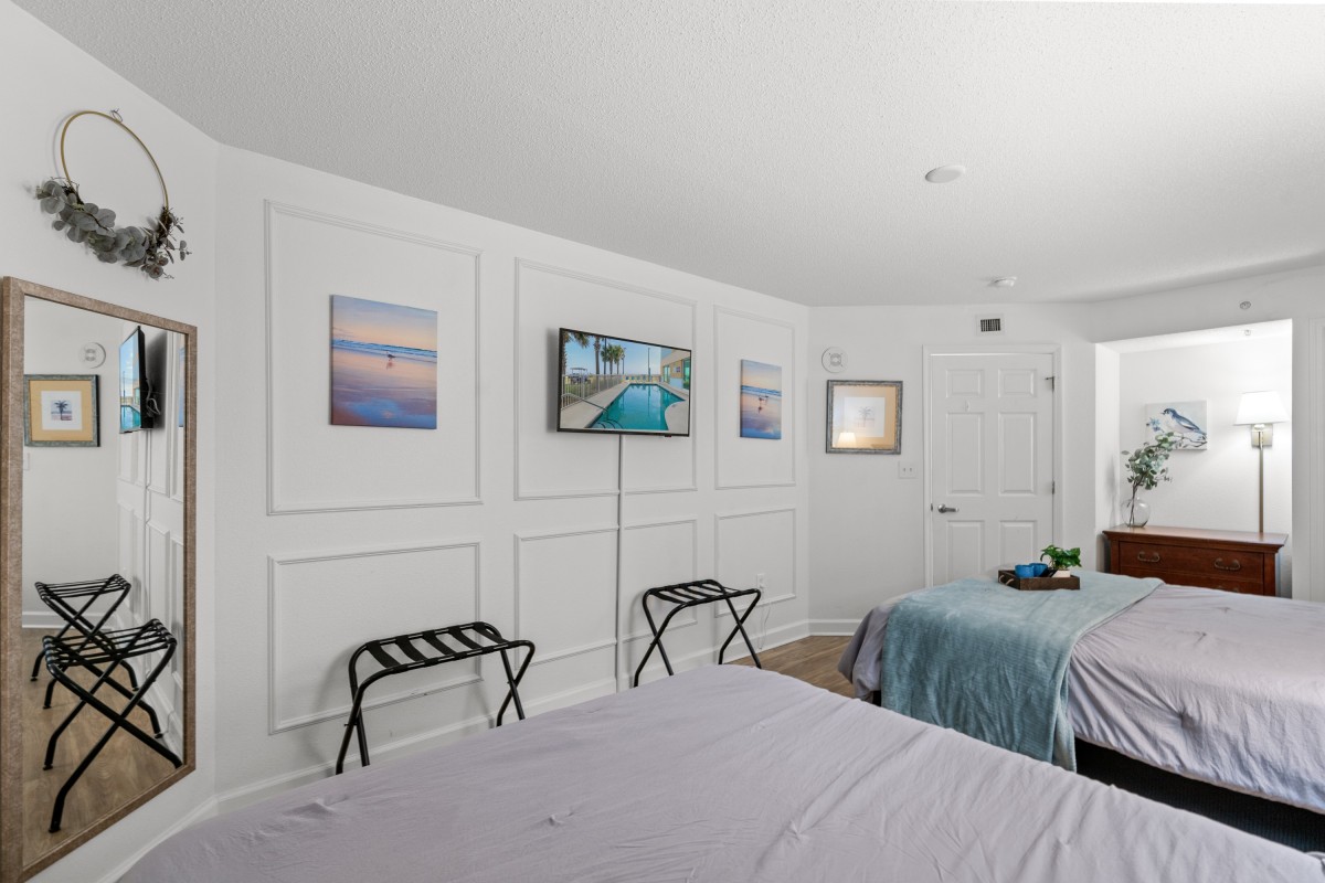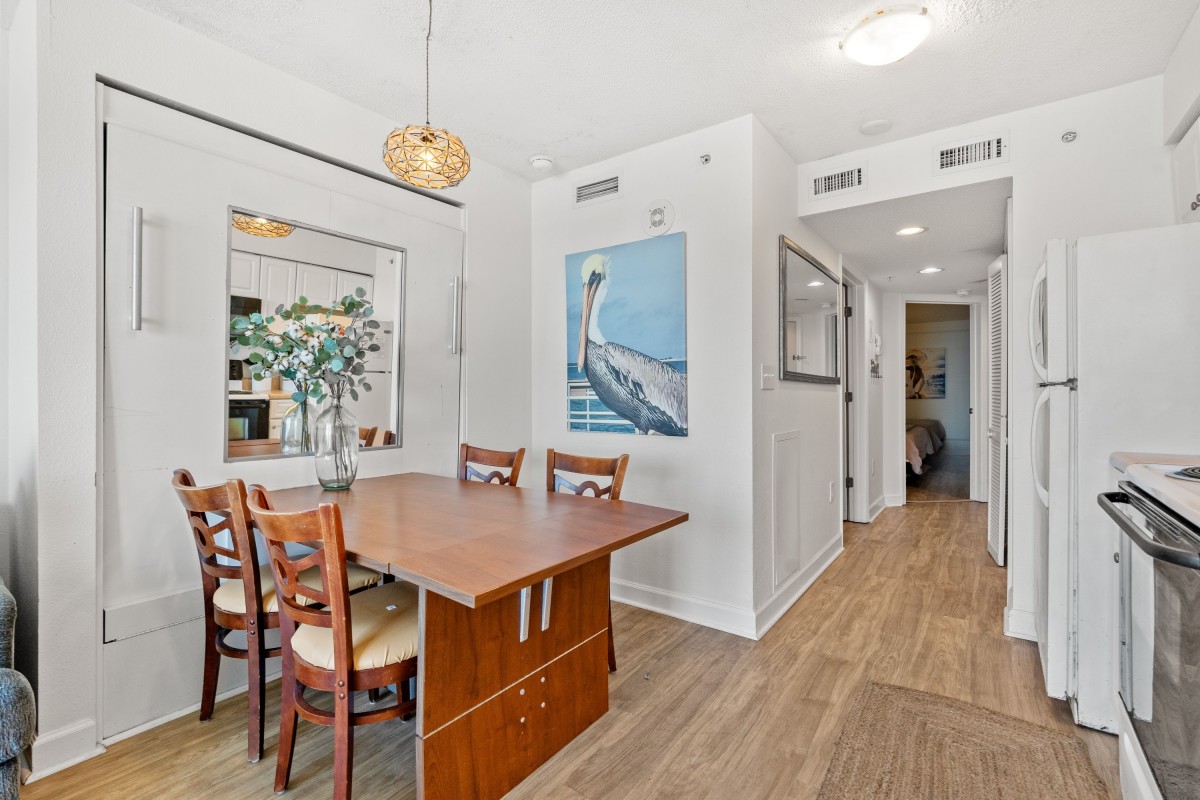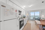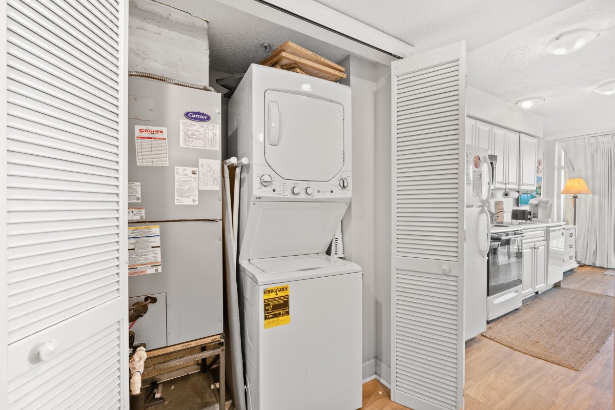 The private furnished balcony is one of the best features. You can sit in this secluded spot for hours while listening to the waves crashing upon the shore, seagulls flying by, and children playing in the sand. You will still have a fantastic view indoors through the sliding glass door. The living room area includes a dining table and is right next to the kitchen. Easily prepare your favorite meals and snacks in the galley-style kitchen with full-sized appliances. There is even a dishwasher! Other amenities include two flatscreen TVs, complimentary WIFI, a washer and dryer, and central heating and air.