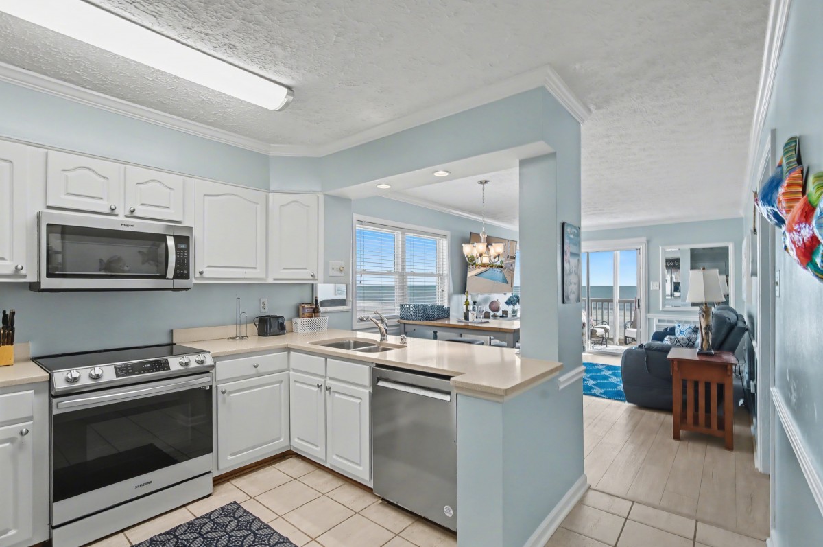 Palmwood Villas 203 has just what you need for a family getaway, fishing trip, or best friend retreat. The bedrooms are spacious. The kitchen, dining, and living area are part of an open floor plan. Prepare meals large and small in the fully equipped kitchen. There are two kinds of coffeemakers-the traditional brewing coffee or a Keurig coffeemaker. Other amenities include three flatscreen TVs, central heating and air, a washer and dryer, and complimentary WIFI. A furnished balcony provides an excellent place for enjoying the ocean breeze while clearing your busy mind. Watch a beach sunrise from this private perch or stargaze with a loved one.