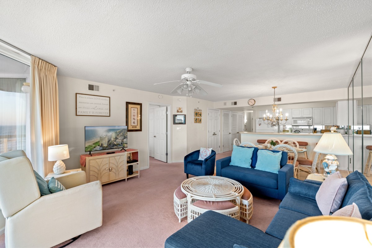 The principal bedroom has a King bed and a spectacular view of the ocean with floor-to-ceiling windows. It directly walks out to the balcony. The ensuite has double sinks, separate shower and tub. The walk-in closet has lots of space and storage. Each Bedroom has a flat screen TV and access to a bathroom with a tub/shower combination. The Kitchen is well equipped to eat in if you enjoy cooking. There are a lot of great eating places in the area if you want the night off. This North Myrtle Beach condo even has wireless Internet access, making it easy to make tee times or dinner reservations at one of the hundreds of nearby restaurants.